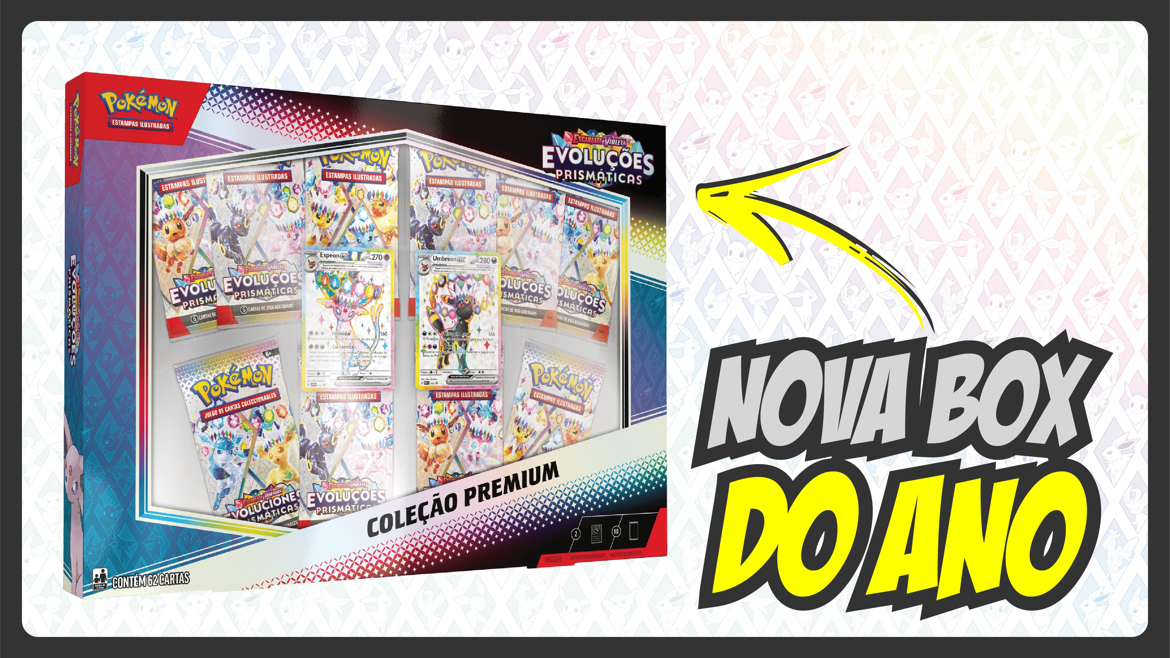 Abri uma Box Premium de Evoluções Prismáticas que vem com as cartas promo do ESPEON e do UMBREON para ver se estava com sorte.